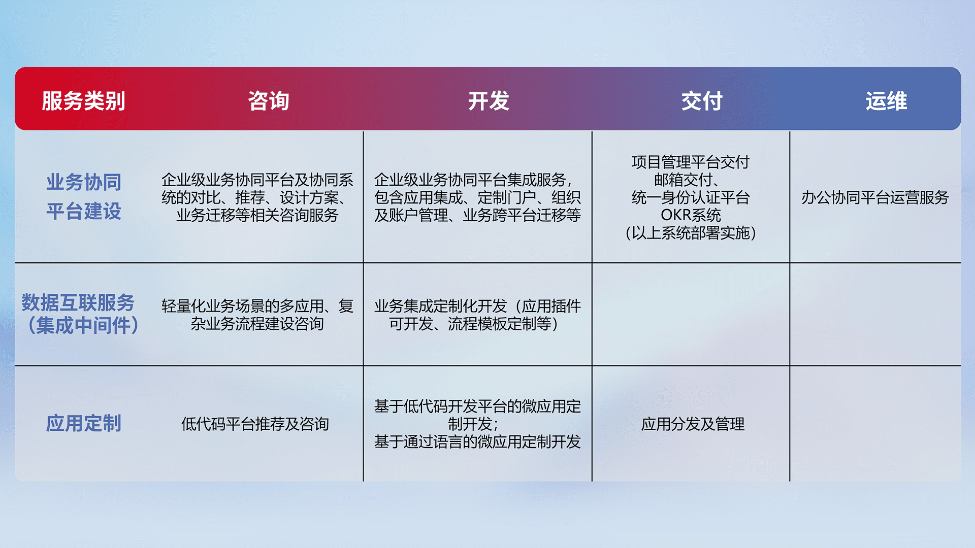 针对钉钉、、、企微、、、IDaas等平台级产品提供产品的规划、、、方案、、、、交付、、定制化开发等服务,,实现如统一协同办公、、、、智能客户服务、、混合会议管理、、、智能数据查询、、等业务场景,,实现数字化转型。。