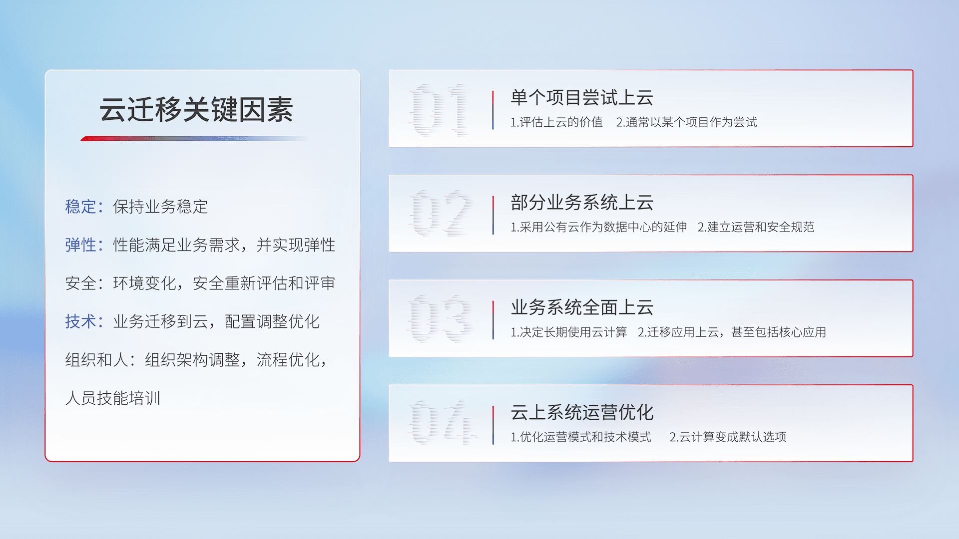 结合实际业务,,从规划设计、、、云平台选型、、、云原生改造、、、数据迁移、、、、集成交付,,迁移全过程为客户识别最佳上云路径,,,做好风险识别管理,,,设计网络架构、、、、身份权限、、安全审计合规、、操作审计、、、日志审计、、、监控告警策略、、、、多站点容灾设计等,,,对云上基础设施进行整体规划,,提升IT治理水平,,,以满足弹性、、、高可用、、、高性能的需求。。。