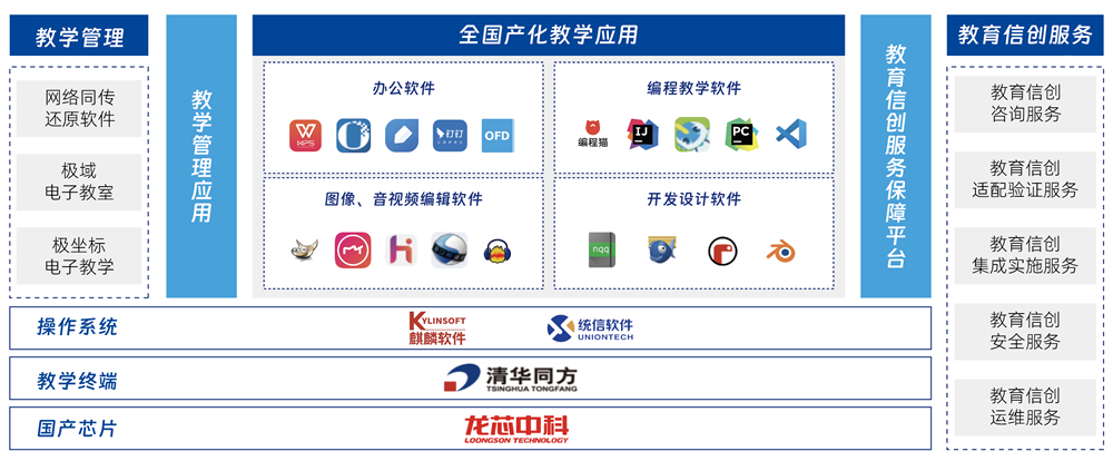 教育信创解决方案,,,,结合信创业务特点和教育信息化行业特色,,,紧贴K12用户教育、、、教学需求。。以校园日常管理与实际教学需求为导向,,通过信创软件与硬件作为方案底层架构。。从底层芯片、、、、整机硬件到基础操作系统软件、、、、教学管理软件、、、办公软件、、编程教学软件等全部实现国产自主化,,,,满足中小学信息技术基础教学空间中的实际使用需求。。。